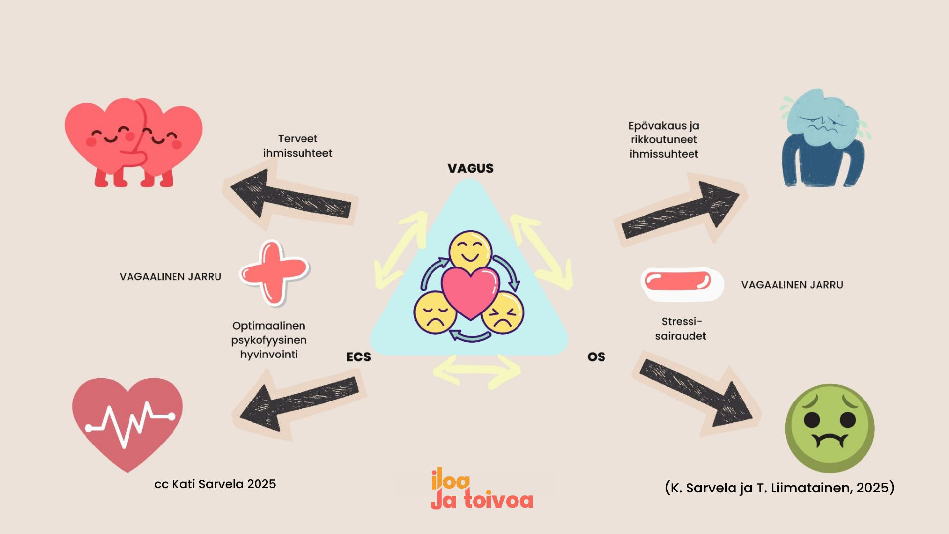 Kuva 1. Ventraalisen vaguksen turvaviesti (vagaalinen jarru toimii) vahvistaa vastavuoroisesti IKK:ta ja tuottaa hyvinvointia. Uhkaavissa tilanteissa VKK:n jarru pettää, ja samalla ECS:n ja OS:n toiminta häiriintyy, mikä näkyy sosiaalisina ongemina ja stressisairauksina.