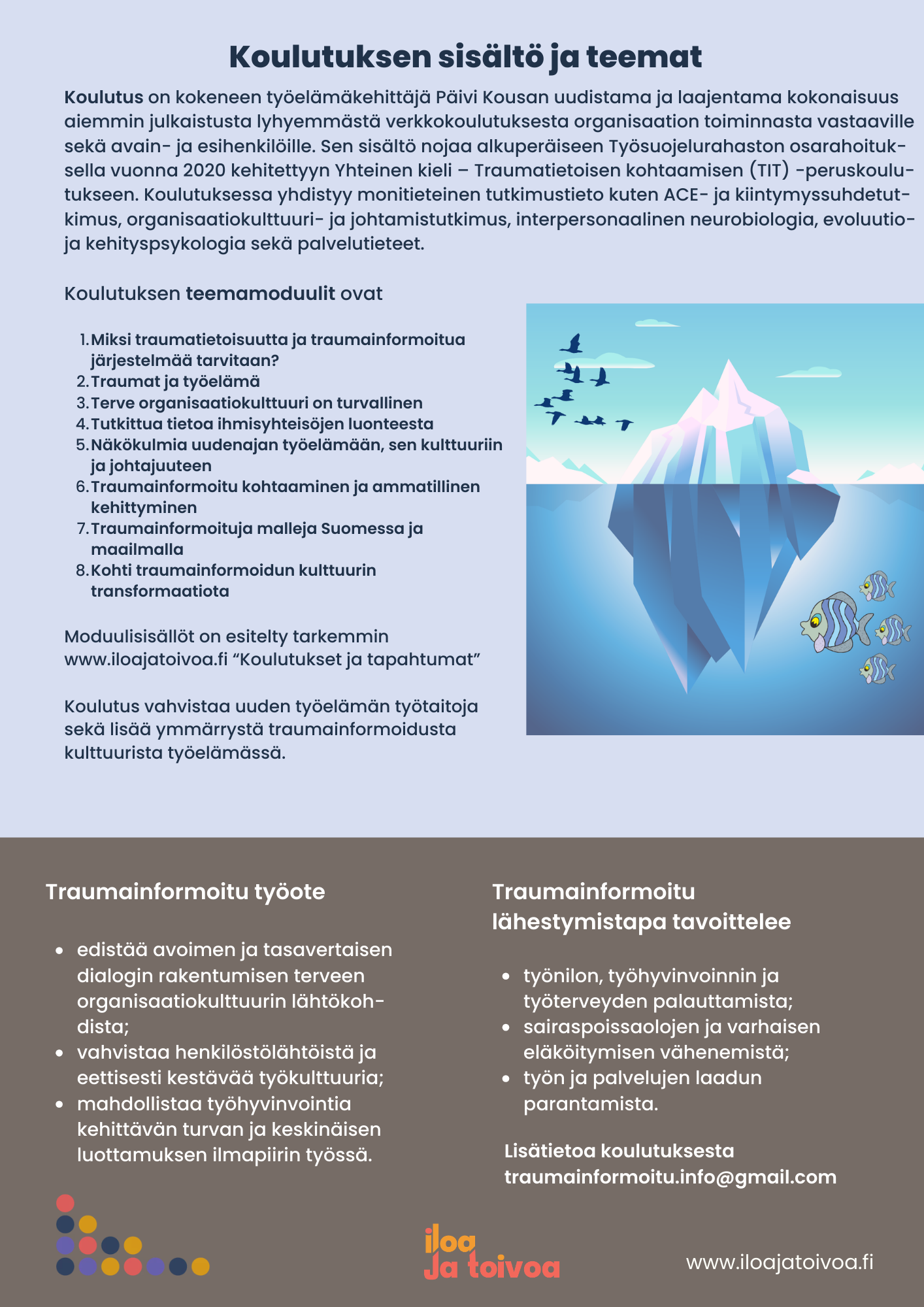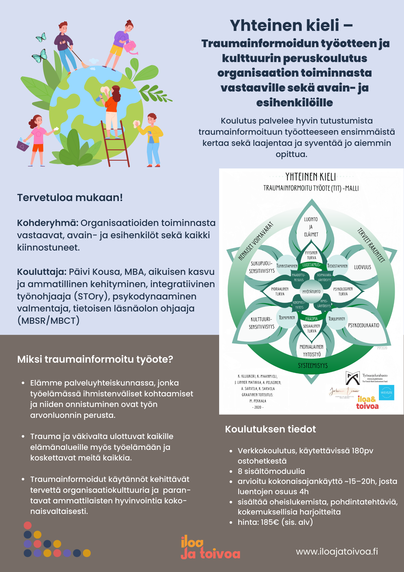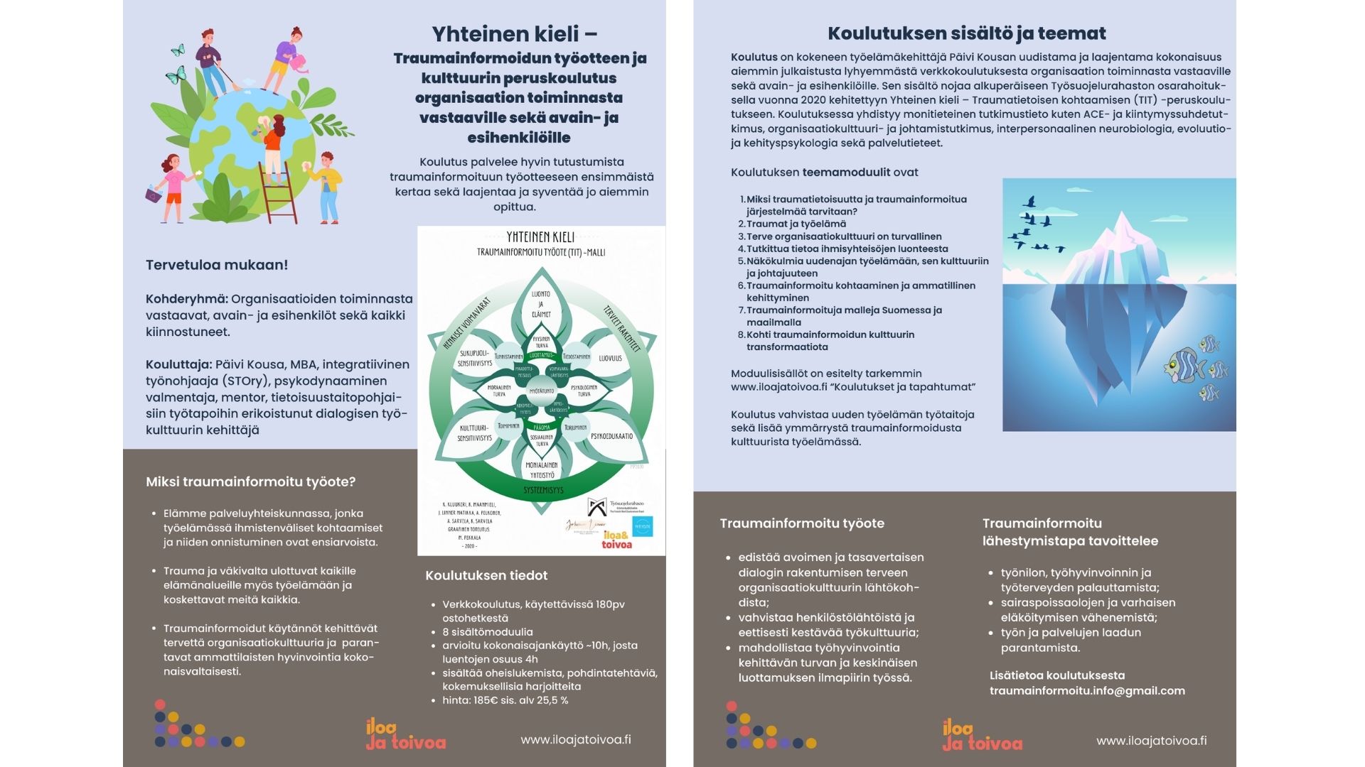 Tämä Yhteinen kieli -koulutus on traumainformoidun työotteen ja kulttuurin tason 2 peruskoulutus, jossa käydään läpi otsikon teemoja uudistuvan työelämäkulttuurin näkökulmasta. Koulutus soveltuu traumainformoidun työotteen peruskoulutukseksi kaikille aiheesta kiinnostuneille ja aivan erityisesti organisaation toiminnasta vastaaville sekä avain- ja esihenkilöille kaikilla toimialoilla.